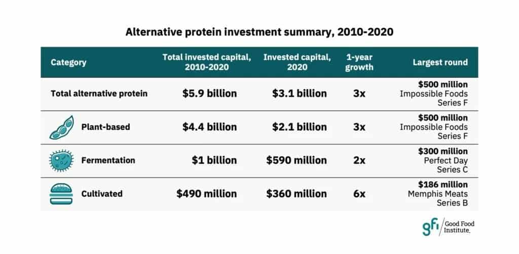 The report states that global alternative protein companies received $3.1 billion in disclosed investments in 2020, which is more than three times as much as the $1 billion raised in 2019 and four and a half times as much as the $694 million raised in 2018.